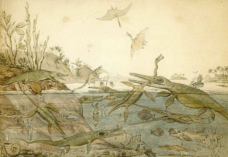 Nella prima metà del diciannovesimo secolo le scoperte di nuovi fossili erano ancora sporadiche e c’era una certa confusione intorno alla paleontologia, una disciplina emergente e che doveva essere ancora formalizzata del tutto. Fu in questo contesto che nel 1830 il geologo britannico Henry De la Beche dipinse Duria Antiquior, un acquerello che mostra una grande varietà di animali preistorici quasi tutti acquatici, con alcuni rettili volanti in cielo. Alcuni erano rappresentati in modo più fedele di altri, per lo meno con una buona aderenza alle conoscenze scientifiche dell’epoca ancora limitate. De la Beche avrebbe negli anni successivi prodotto molte altre illustrazioni, a volte con qualche guizzo umoristico e per prendere in giro altri colleghi come lo stesso Buckland.