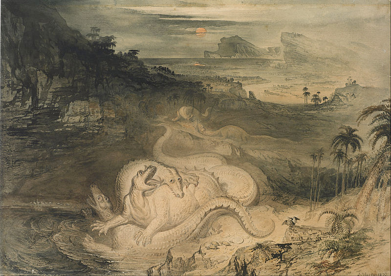 Mantell era molto fuoristrada rispetto a come appariva davvero un Iguanodon, ma negli anni successivi alla pubblicazione dei suoi lavori quell’idea di una enorme iguana preistorica condizionò il lavoro di vari artisti. Il pittore britannico John Martin trasse ispirazione da Mantell per disegnare nel 1837 “The Country of the Iguanodon”, un disegno su carta in cui alcuni iguanodonti lottano tra loro prendendosi a morsi. L’illustrazione è molto dinamica, ma ha ancora qualcosa dell’arte antica con la rappresentazione di animali che ricordano i draghi. Non manca nella parte destra del disegno un piccolo pterodattilo che osserva la scena, tenendo le ali aperte.