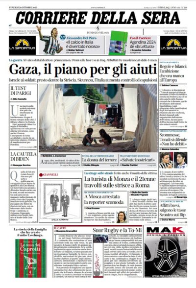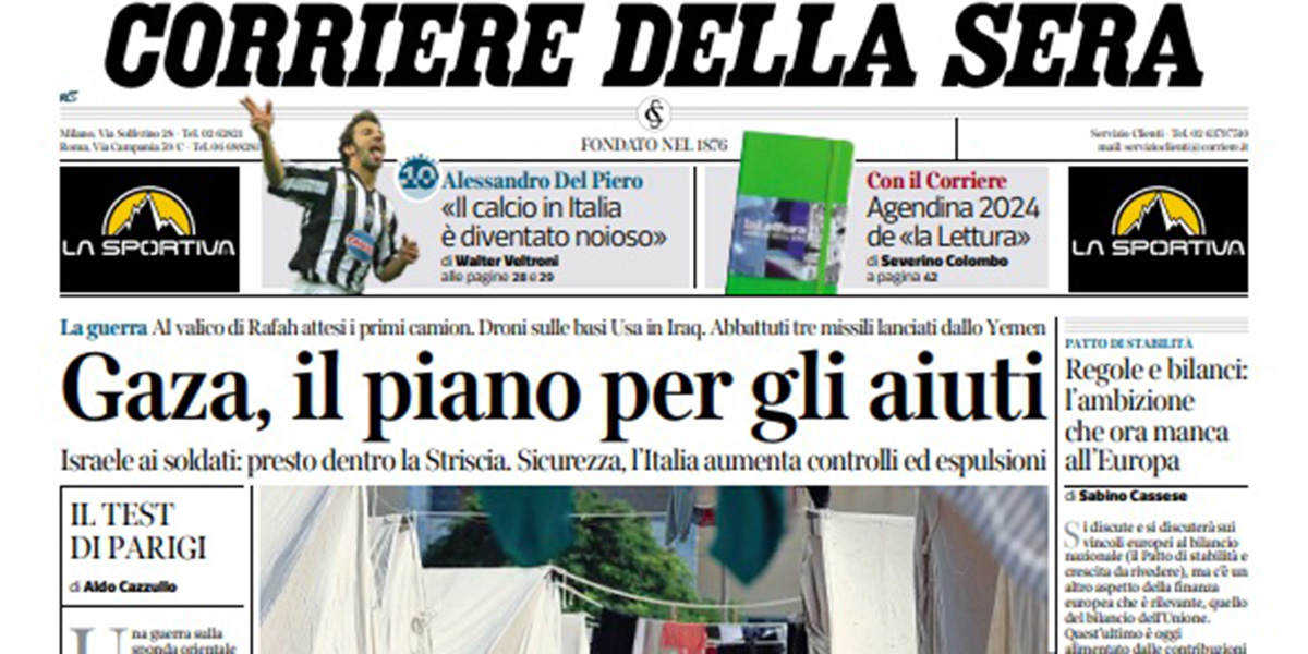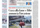 I titoli di apertura dei giornali di oggi riguardano sempre la situazione in Medio Oriente, con l’attesa per l’apertura del varco di Rafah per l’ingresso nella Striscia di Gaza dei primi aiuti umanitari, le preoccupazioni per la situazione al confine fra Israele e Libano, dove si intensificano gli attacchi fra il gruppo armato libanese sciita Hezbollah e l’esercito israeliano, e l’intervento via terra israeliano nella Striscia di Gaza che sembra avvicinarsi dopo la visita del primo ministro Netanyahu ai soldati schierati al confine.