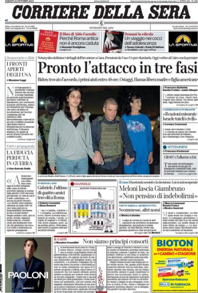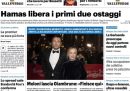 Sono due le notizie principali in apertura sui giornali di oggi: quelle relative al conflitto fra Israele e Hamas, con la liberazione di due donne americane fra gli oltre duecento ostaggi presi da Hamas negli attacchi contro Israele di due settimane fa e l’attesa per l’apertura del varco di Rafah per consentire il passaggio verso la Striscia di Gaza dei camion con gli aiuti umanitari, e l’annuncio della presidente del Consiglio Meloni della fine della sua relazione con Andrea Giambruno, dopo la diffusione di fuorionda imbarazzanti e volgari di Giambruno.