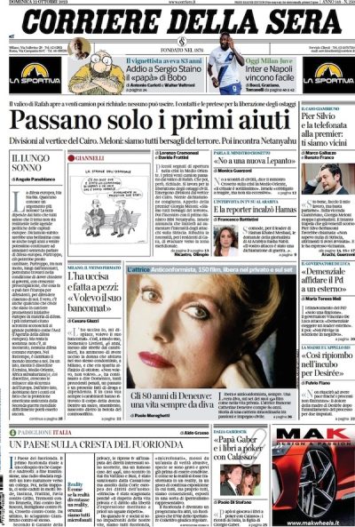 I temi principali delle prime pagine dei quotidiani riguardano il conflitto fra Israele ed Hamas: il passaggio dei primi aiuti attraverso il varco di Rafah fra Egitto e Striscia di Gaza, la questione degli ostaggi, il vertice fra i paesi arabi e l’Unione Europea. Alcuni giornali dedicano la loro apertura alla visita della presidente del Consiglio Meloni in Israele, il Giornale pubblica una sua intervista che fa un bilancio di un anno di governo. La morte di Sergio Staino e quella di Bobby Charlton trovano spazio nelle prime pagine di molti giornali, Repubblica riserva il titolo centrale alle dimissioni dei medici dalla sanità pubblica.