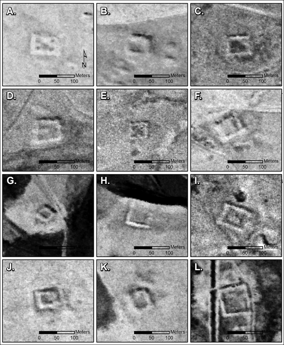 La forma più comune individuata dallo studio è quella di una struttura quadrata, dai lati di lunghezza compresa fra 50 e 80 metri. «Spesso si tratta di edifici isolati, lontani da altre strutture archeologiche evidenti, e situati di frequente in ambienti marginali con scarse tracce di altri insediamenti antichi e moderni», si legge nello studio.