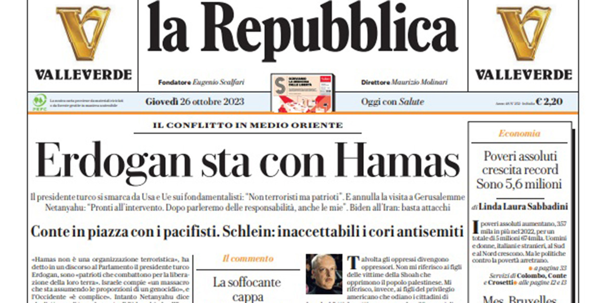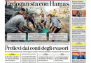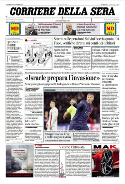 Le notizie principali di oggi sulla guerra fra Israele e Hamas sono le parole del presidente turco Erdogan, che in un intervento in parlamento ha detto che Hamas non è un’organizzazione terroristica ma un gruppo di liberazione, il discorso televisivo del primo ministro israeliano Netanyahu, che ha confermato l’intenzione di invadere la Striscia di Gaza, e l’incontro a Beirut fra alcuni dei capi di Hamas, Hezbollah e Jihad Islamico. Qualche giornale rimane invece sui contenuti della bozza della legge di bilancio, e soprattutto sulla norma che prevede che il fisco possa accedere più facilmente ai dati dei conti correnti dei contribuenti, il Giornale si occupa dei rapporti fra Giorgia Meloni e Marina Berlusconi, il Fatto prosegue la sua inchiesta sui guadagni del sottosegretario alla Cultura Sgarbi, Libero attacca Di Battista per le sue dichiarazioni su Israele, e la Verità apre su un presunto caso di visti falsi rilasciati da alcune ambasciate italiane. I giornali sportivi commentano le due sconfitte di Milan e Lazio in Champions League.