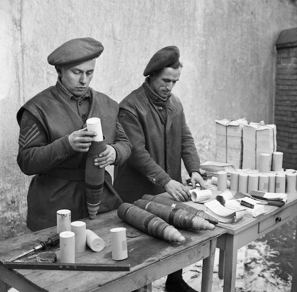 Soldati assemblano “bombe” di volantini nei Paesi Bassi nel 1945 (Wikicommons)