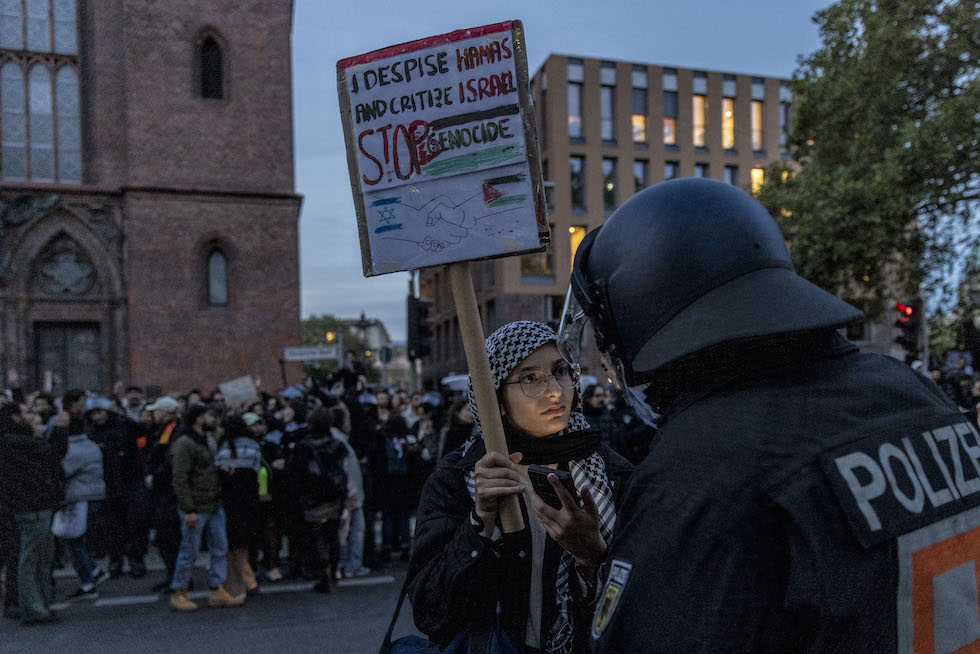 Una partecipante a una manifestazione per la pace a Gaza parla con un poliziotto a Berlino, il 18 ottobre 2023; sul cartello c’è scritto «Odio Hamas e critico Israele, stop al genocidio» (Maja Hitij/Getty Images)