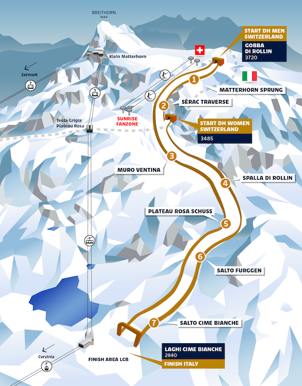 La Gran Becca, che è stata chiamata così dal nome valdostano del Cervino, la montagna col profilo più noto della regione, è lunga 3,7 chilometri e ha la partenza a un’altitudine di 3.720 metri, cosa che la rende la pista più alta di tutta la Coppa del Mondo. Per due terzi della sua lunghezza la pista passa sopra dei ghiacciai, quello del Teodulo e quello di Valtournanche. Avrebbe dovuto essere usata già l’anno scorso per la Coppa del Mondo, ma a causa della mancanza di neve legata alla lunga siccità del 2022 era stato impossibile organizzare le gare.