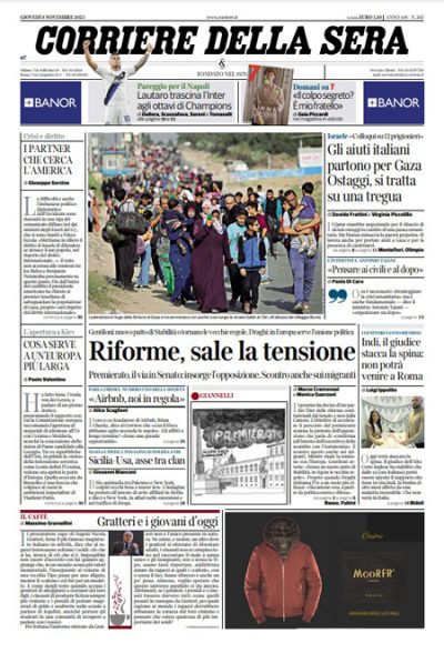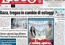 Le notizie principali sulla guerra fra Hamas e Israele in apertura sui giornali di oggi sono le trattative diplomatiche in corso per ottenere la liberazione di alcuni ostaggi in cambio di una tregua nei combattimenti e l’invio da parte dell’Italia verso la Striscia di Gaza di una nave militare con funzioni di ospedale per soccorrere le persone ferite nella guerra. Le altre notizie sulle prime pagine sono il cammino parlamentare della legge di bilancio, su cui apre Repubblica, ancora le reazioni all’accordo fra Italia e Albania sui centri per i migranti, le dichiarazioni dell’ex presidente del Consiglio Draghi sul rischio di recessione in Europa (che il Giornale interpreta al contrario degli altri giornali in senso positivo), la decisione dei giudici dell’Alta Corte di Londra di interrompere i trattamenti vitali alla bambina Indi Gregory, e quella del Vaticano sul battesimo e la possibilità di essere padrino di battesimo o testimone di matrimonio per le persone omosessuali e transessuali.