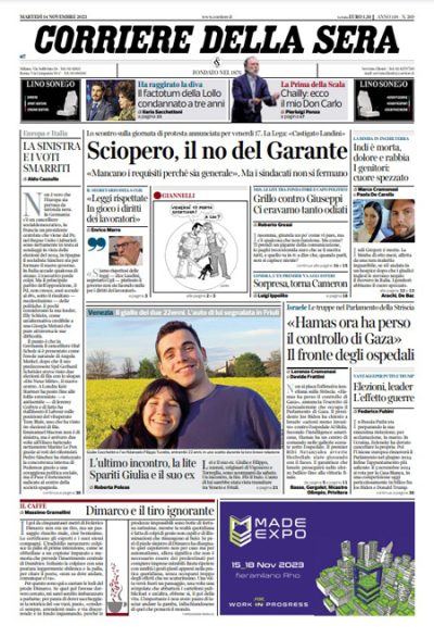 Quasi tutti i giornali di oggi si occupano in apertura dello sciopero indetto da CGIL e UIL per venerdì prossimo, sul quale la Commissione di garanzia per gli scioperi ha confermato il parere per cui non può essere considerato uno sciopero generale, aprendo quindi alla possibilità di precettazione dei lavoratori da parte del governo. Il Secolo XIX e Avvenire titolano invece sulla guerra fra Hamas e Israele, la Stampa si occupa delle valutazioni della Banca d’Italia sulla legge di bilancio, e il Fatto critica la sentenza della Corte Costituzionale sulle intercettazioni del caso Palamara.