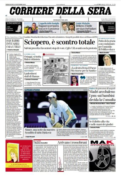 Le discussioni sullo sciopero di venerdì prossimo della CGIL e della UIL sono la notizia principale sui giornali di oggi, con la decisione del ministro dei Trasporti Salvini di precettare i lavoratori e ridurre a 4 ore la durata dello sciopero e la conferma dei sindacati di voler confermare la protesta secondo le modalità già annunciate. La Stampa e il Messaggero titolano invece sulle trattative per la liberazione degli ostaggi presi da Hamas negli attacchi a Israele del 7 ottobre, Avvenire si occupa della guerra fra Russia e Ucraina, il Fatto prende spunto dalla vicenda di Indi Gregory per esaminare come vengono effettuati in Italia i test sui neonati alla ricerca di malattie rare, e i giornali sportivi celebrano la vittoria di Sinner contro Djokovic alle ATP Finals di tennis di Torino.