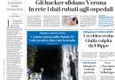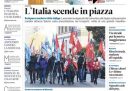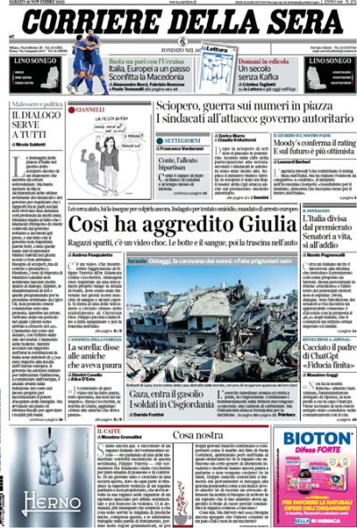 Sono due le notizie principali sulle quali aprono i giornali di oggi: lo sciopero di ieri di CGIL e UIL, sul quale i titoli e i commenti danno valutazioni opposte – un successo per i sindacati, un fallimento per il ministro delle Infrastrutture Salvini e i giornali di destra -, e l’accusa di tentato omicidio per Filippo Turetta, dopo il ritrovamento di un video in cui lo si vede aggredire l’ex fidanzata Giulia Cecchettin e poi caricarla ferita e sanguinante in macchina. Repubblica apre invece sui disegni di legge “sicurezza” approvati giovedì dal Consiglio dei ministri, che prevedono pene maggiori per alcuni reati e nuove regole per le forze dell’ordine, il Sole 24 Ore si occupa dei pagamenti del PNRR, Avvenire e il Secolo XIX presentano il rapporto della Caritas sull’esclusione sociale, e i giornali sportivi commentano la vittoria nelle qualificazioni agli Europei di calcio dell’Italia, che raggiunge così il secondo posto in classifica che le garantirebbe la qualificazione, e presentano la semifinale delle ATP Finals di tennis di Jannik Sinner.