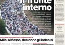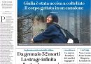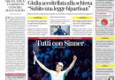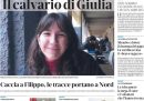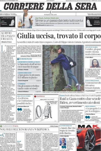 La notizia principale sui giornali di oggi è il ritrovamento del corpo di Giulia Cecchettin, la ragazza che era scomparsa l’11 novembre insieme all’ex fidanzato Filippo Turetta, al momento ricercato per tentato omicidio. Alcuni giornali aprono con le notizie sulla guerra in corso tra Israele e Hamas, oppure con le norme del nuovo “pacchetto sicurezza” approvato giovedì dal governo di Giorgia Meloni. Tutti i principali quotidiani sportivi hanno come prima notizia la vittoria di Jannik Sinner alla semifinale delle ATP Finals.