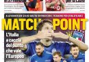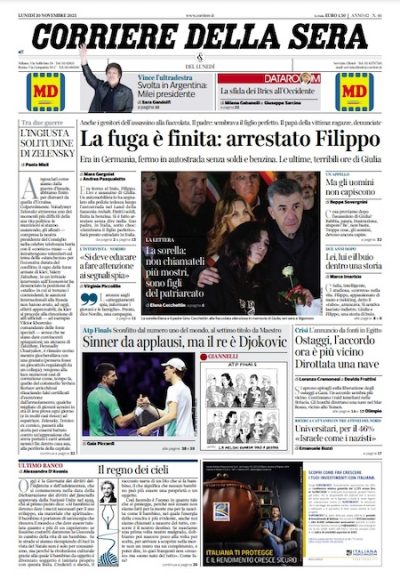 Tutti i giornali di oggi si occupano in apertura dell’arresto in Germania di Filippo Turetta, il ragazzo accusato per l’omicidio di Giulia Cecchettin, e delle parole del padre e della sorella della ragazza durante una fiaccolata organizzata nel paese dove vivono in Veneto. Fa eccezione il Fatto, che titola sulla trattativa per cercare di liberare una parte degli ostaggi presi da Hamas durante gli attacchi a Israele del 7 ottobre, mentre i giornali sportivi presentano la partita di calcio di stasera fra Italia e Ucraina che deciderà chi si qualificherà per i prossimi Europei e commentano la vittoria nelle ATP Finals di tennis di Djokovic, che ha battuto Sinner in finale.