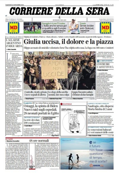 La vicenda del femminicidio di Giulia Cecchettin è ancora in apertura su tutti i giornali, con le ricostruzioni della dinamica dei fatti, le manifestazioni organizzate in molte città contro la violenza di genere, e le parole di sua sorella in una lettera pubblicata dal Corriere del Veneto. Il Messaggero apre sui pensionamenti dei medici, mentre il Fatto si occupa della sentenza del processo contro la ’ndrangheta con oltre 300 imputati fra i quali l’ex parlamentare di Forza Italia Pittelli. I giornali sportivi festeggiano il pareggio con l’Ucraina che consente all’Italia di qualificarsi agli Europei di calcio dell’anno prossimo.