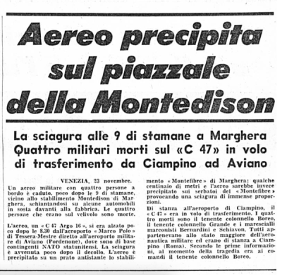 Si schiantò alle 7:35 in un parcheggio del Petrolchimico di Marghera, l’enorme complesso industriale che si affaccia sulla Laguna di Venezia, dopo aver urtato una palazzina della Montedison Fibre al cui interno lavoravano già decine di persone. Nella carambola successiva all’urto, il velivolo distrutto e incendiato si arrestò a poche centinaia di metri da un deposito di fosgene, un gas incolore estremamente velenoso che se respirato provoca la morte in meno di dieci minuti. Nel parcheggio non c’era nessuno e così a morire furono soltanto i quattro membri dell’equipaggio, due ufficiali e due sottufficiali dell’Aeronautica militare italiana: Anano Borreo, colonnello pluridecorato, il tenente colonnello Mario Grande, il maresciallo motorista Aldo Schiavone e il maresciallo marconista Francesco Bernardini.