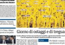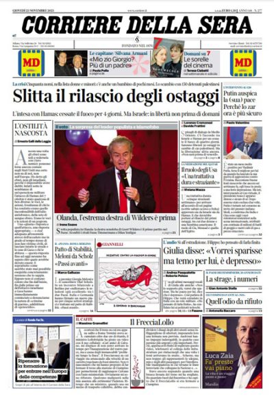 I giornali di oggi fanno scelte diverse per la notizia di apertura: alcuni si occupano dell’accordo fra Hamas e Israele per una tregua nei combattimenti di 4 giorni per consentire lo scambio fra 50 ostaggi presi da Hamas negli attacchi del 7 ottobre e 150 prigionieri palestinesi, che sembrava dover iniziare oggi ma è stato rinviato per ora a domani. Altri seguono la vicenda della morte di Giulia Cecchettin, con le prime dichiarazioni di Filippo Turetta, la diffusione di un audio inviato da Cecchettin a un’amica e la discussione al Senato del disegno di legge contro la violenza sulle donne, altri ancora aprono sull’incontro di ieri fra la presidente del Consiglio Meloni e il cancelliere tedesco Scholz. La Stampa anticipa la decisione della Commissione europea sulle modifiche al PNRR richieste dall’Italia, il Sole 24 Ore apre sulle nuove norme europee sugli imballaggi, e il Fatto, il Riformista e l’Unità seguono la vicenda del treno in ritardo fatto fermare dal ministro dell’Agricoltura Lollobrigida per poter scendere.