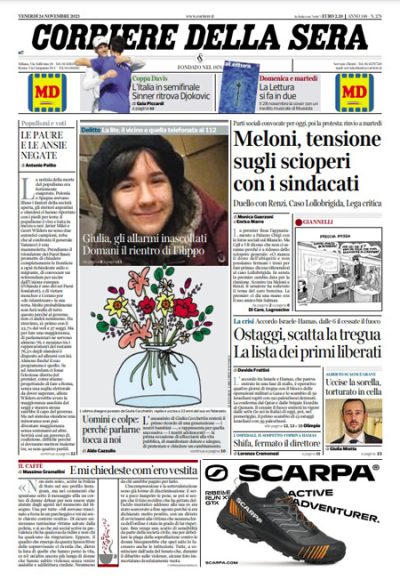 Le notizie principali sulle prime pagine dei giornali di oggi sono la morte di Giulia Cecchettin, con le indagini sulla notte in cui è stata uccisa, il rientro in Italia di Filippo Turetta e la manifestazione contro la violenza di genere in programma domani a Roma, lo sciopero dei trasporti in programma lunedì e l’incontro fra governo e sindacati rinviato a martedì prossimo, la tregua fra Hamas e Israele che dovrebbe iniziare oggi per permettere la liberazione di una parte degli ostaggi presi da Hamas, la vicenda del treno fatto fermare dal ministro dell’Agricoltura Lollobrigida, e i risultati delle elezioni nei Paesi Bassi.