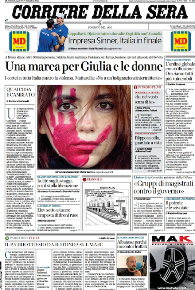 Quasi tutti i quotidiani stamattina aprono con le foto delle enormi manifestazioni per la giornata internazionale contro la violenza sulle donne che si sono tenute nelle principali città italiane. Nelle prime pagine trova spazio anche la vittoria del tennista italiano Jannik Sinner contro quello serbo Novak Djokovic nella Coppa Davis di tennis, celebrata anche dai quotidiani sportivi.