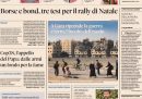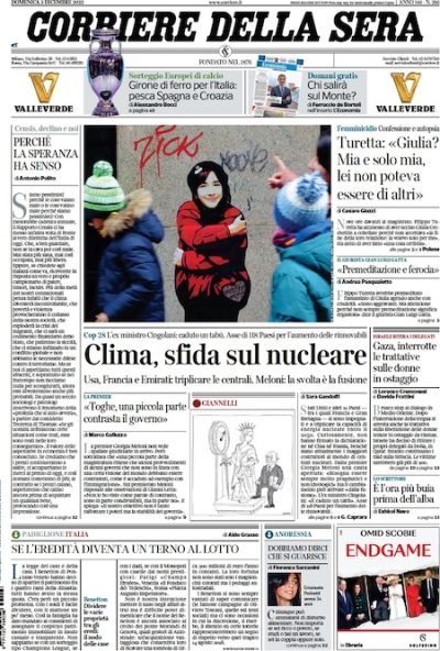 Le principali notizie in apertura sui giornali di oggi sono la COP28, la grande riunione internazionale annuale in cui si discute di come contrastare il cambiamento climatico, e l’interruzione delle trattative per la liberazione di nuovi ostaggi a Gaza. Un’altra notizia piuttosto presente è, come nei giorni scorsi, lo scontro tra governo e magistratura, questa volta attorno a un commento fatto dalla presidente del Consiglio Giorgia Meloni proprio alla COP28. Anche oggi sono molto presenti vari aggiornamenti e dettagli sull’omicidio di Giulia Cecchettin. La Stampa apre con un’intervista al commissario europeo per gli Affari economici sul Patto di Stabilità. Il Corriere della Sera mette in prima pagina anche l’attacco a Parigi di sabato sera.