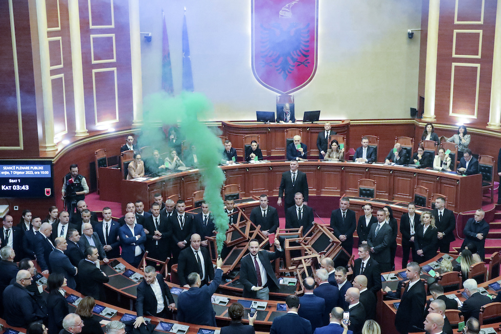 Giovedì l’Assemblea dell’Albania, il parlamento monocamerale del paese, stava votando l’annuale legge di bilancio per il 2024, poi approvata. La seduta però è durata solo pochi minuti, perché i parlamentari dell’opposizione hanno acceso alcuni fumogeni e hanno ammucchiato le sedie al centro dell’aula, scontrandosi con i responsabili della sicurezza. Soltanto lunedì il ministro dell’Interno Taulant Balla aveva chiesto che la magistratura aprisse un’indagine nei confronti dei deputati che quel giorno avevano dato fuoco ad alcuni documenti in aula. Il deputato d’opposizione Flamur Noka aveva anche gettato alcuni fogli in fiamme su una catasta di sedie. Balla aveva chiesto l’applicazione degli articoli del codice penale albanese che puniscono chi danneggia o distrugge la proprietà altrui.