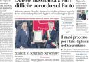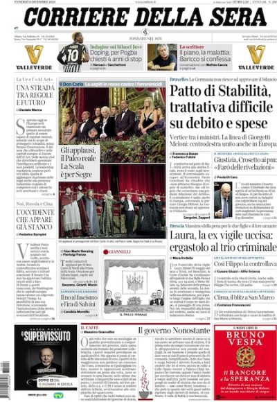 Le prime pagine dei quotidiani di oggi sono dedicate a temi diversi: La Stampa apre la sua con le discussioni sul Meccanismo Europeo di Stabilità (MES), un’istituzione europea che ha lo scopo di aiutare i paesi dell’Eurozona in difficoltà economica, mentre sia Il Messaggero che Il Sole 24 Ore danno spazio alle decine di sospetti miliziani di Hamas fermati e interrogati giovedì dall’esercito israeliano, di cui sono circolate varie foto e video piuttosto impressionanti. L’Unità apre sulla dibattuta questione del salario minimo, Libero cita la prima della Scala di Milano con la senatrice a vita Liliana Segre accompagnata dal sindaco Beppe Sala e dal presidente del Senato Ignazio La Russa. Gli sportivi aprono sulla partita di Serie A Juventus-Napoli, in programma questa sera.