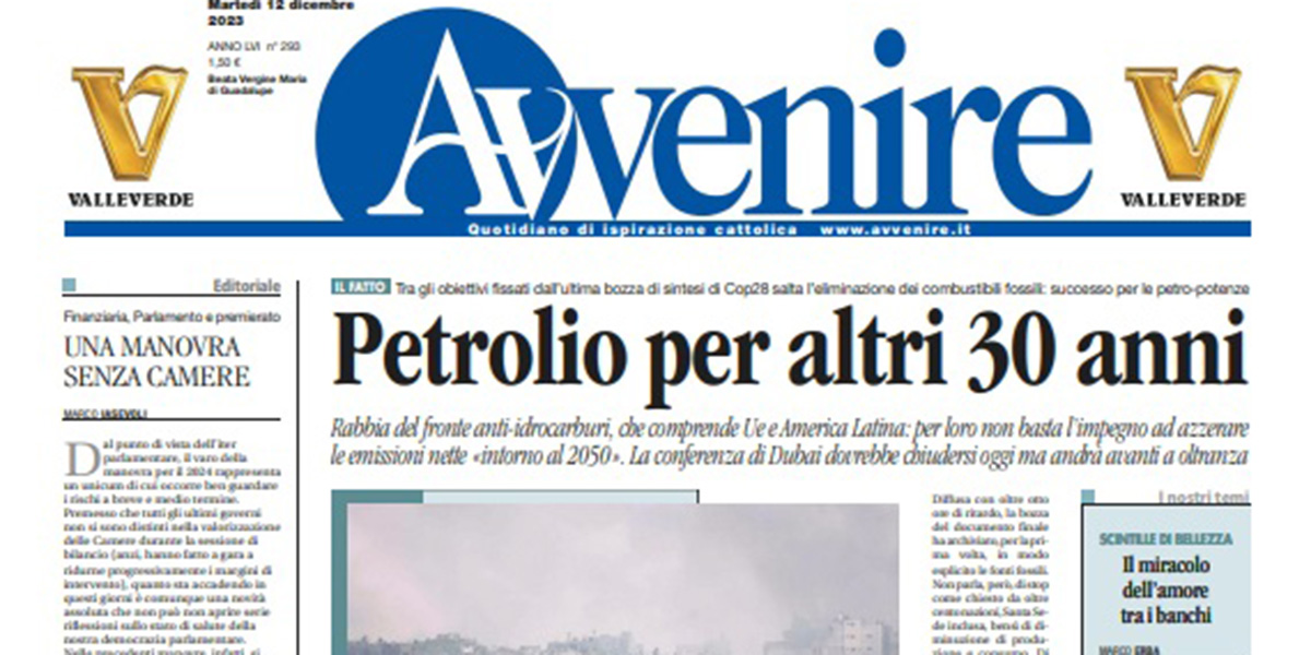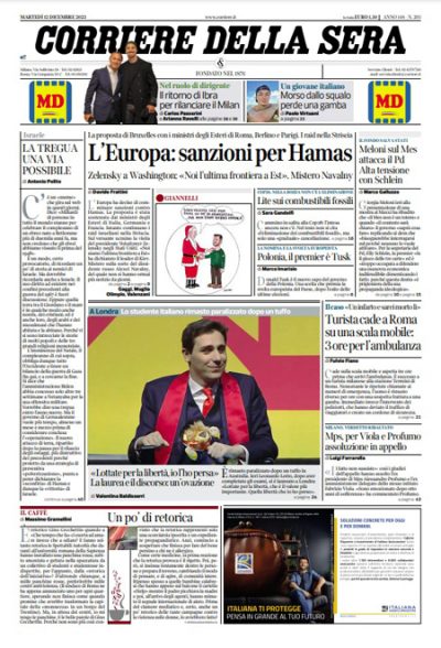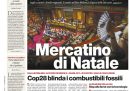 I giornali di oggi dedicano l’apertura a notizie diverse: alcuni si occupano della bozza dell’accordo finale della conferenza sul clima COP28, che non comprende più l’abbandono dell’uso dei combustibili fossili ma un più generico impegno a ridurne l’utilizzo, altri fanno ipotesi sui contenuti definitivi della legge di bilancio che verrà approvata dal parlamento, altri ancora si occupano dei tagli ai fondi per la gestione dei migranti. Il Corriere della Sera apre sulla guerra fra Hamas e Israele, Libero fa i conti con le tredicesime degli italiani, e i giornali sportivi si occupano del ritorno di Ibrahimovic al Milan come consulente del gruppo proprietario.