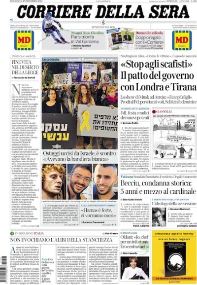 Le notizie principali in apertura sulla maggior parte dei giornali di oggi riguardano la partecipazione del primo ministro britannico Rishi Sunak, di quello albanese Edi Rama e dell’imprenditore Elon Musk ad Atreju, la festa dei giovani di Fratelli d’Italia. Si parla anche delle proteste per l’uccisione di tre ostaggi israeliani nella Striscia di Gaza da parte dell’esercito di Israele, della condanna in primo grado del cardinale Angelo Becciu per peculato e della morte di 61 persone migranti a causa di un naufragio al largo della Libia. Il Sole 24 Ore apre con un articolo sulla situazione dei taxi nelle grandi città, mentre il Manifesto dedica l’apertura alla morte di Toni Negri.