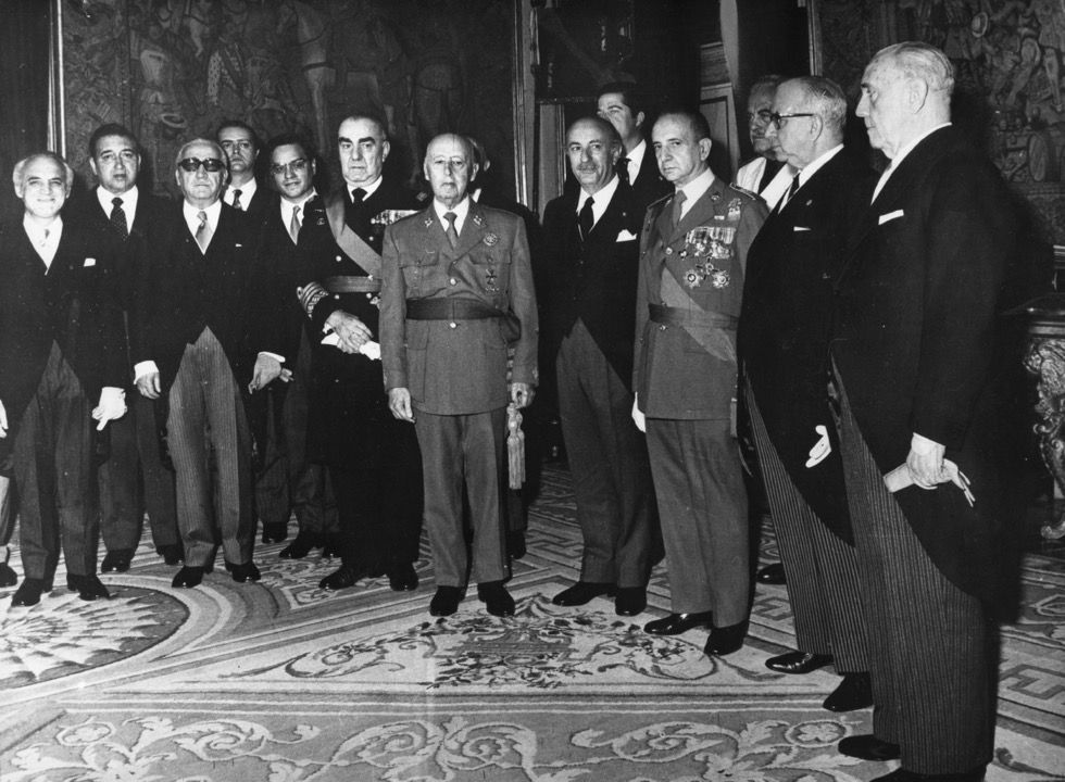Luis Carrero Blanco, sul centrodestra in divisa militare, giura come primo ministro con Francisco Franco (Photo by Keystone/Getty Images)