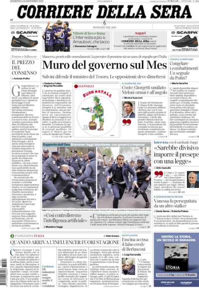 Negli ultimi giorni i quotidiani italiani stanno prolungando il dibattito su notizie non freschissime, diciamo: la mancata approvazione del MES da parte del parlamento italiano, avvenuta giovedì, e il caso legato a Chiara Ferragni e alla sua sponsorizzazione di un pandoro Balocco, ancora precedente. Sui giornali sportivi trova spazio l’ennesima vittoria dell’Inter, saldamente prima in classifica in Serie A.