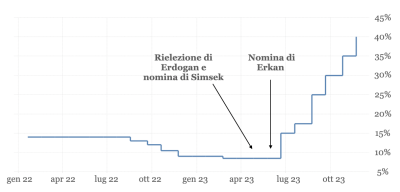 Questo rende l’idea dell’urgenza di combattere l’inflazione in Turchia. E per farlo la banca centrale ha deciso una serie di consistenti e rapidi aumenti dei tassi di interesse di riferimento: in sei mesi li ha fatti salire da meno del 10 per cento fino al 40 per cento.