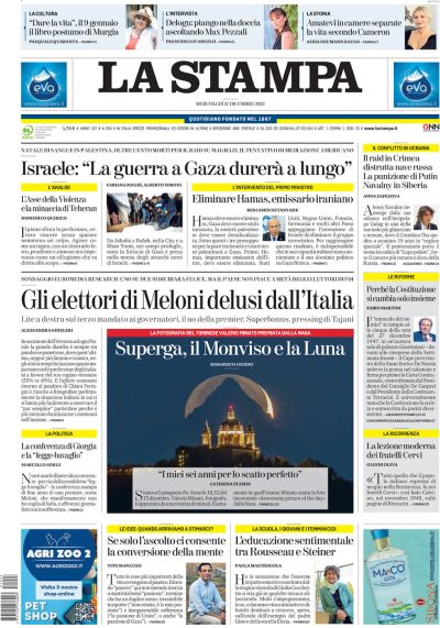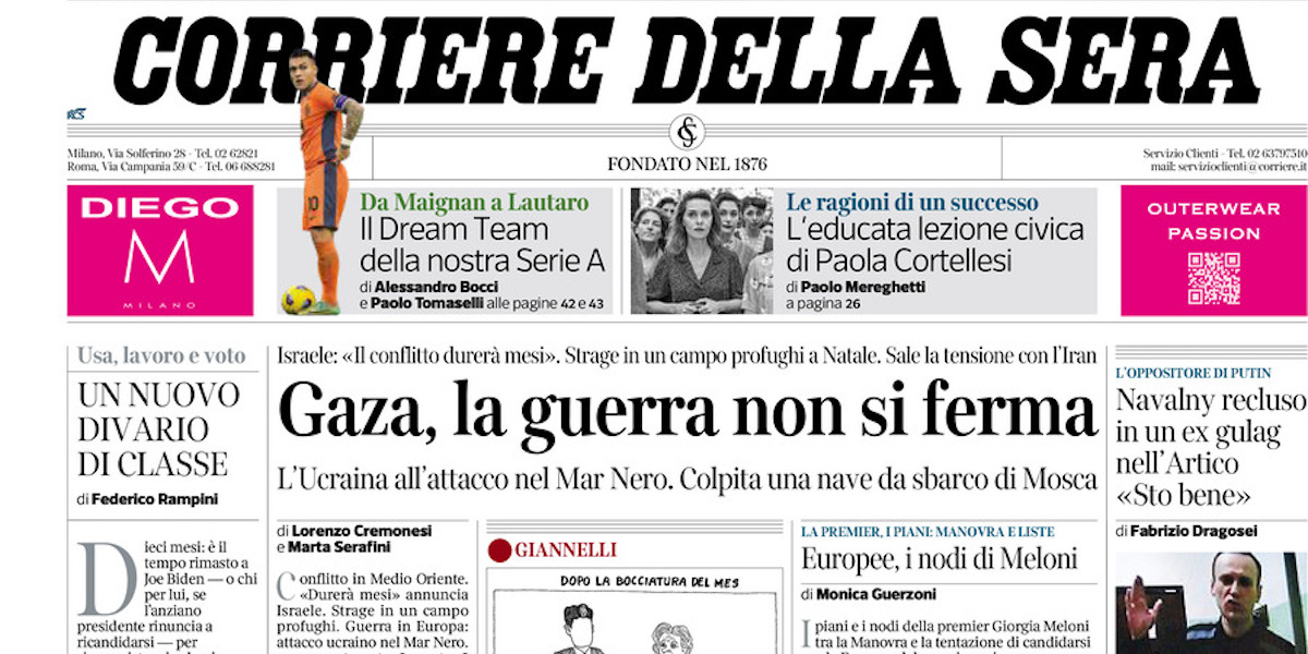 Tra i principali quotidiani italiani oggi Corriere della Sera e Stampa si concentrano sulla guerra nella Striscia di Gaza, che l’esercito israeliano ha annunciato durerà ancora «molti mesi». Repubblica invece parla delle difficoltà di Forza Italia in vista delle elezioni europee che si terranno a giugno del 2024, dove il partito rischierebbe di perdere consensi a favore degli alleati di governo più forti, Fratelli d’Italia e Lega. Tra i quotidiani dell’area di destra Il Giornale fa il suo titolo principale sui debiti della squadra di calcio dell’Inter, mentre Libero parla del reddito del deputato del Gruppo Misto Aboubakar Soumahoro e di una polemica che riguarda il piccolo partito +Europa. Gli sportivi scrivono soprattutto di cosa dovranno fare le principali squadre del campionato di calcio italiano durante il calciomercato di gennaio, la sessione di un mese in cui le squadre possono comprare e vendere calciatori.