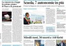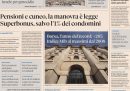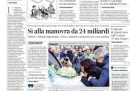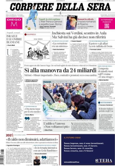 La principale notizia in apertura sui giornali di oggi riguarda l’approvazione in via definitiva, alla Camera, della legge di bilancio, il provvedimento con cui il parlamento decide come spendere le finanze pubbliche. Un’altra notizia molto presente è l’inchiesta della procura di Roma sulla famiglia dell’ex senatore Denis Verdini e sui presunti illeciti commessi nella partecipazione ai bandi di gara di ANAS. Si parla poi dell’estesissimo bombardamento russo sull’Ucraina compiuto venerdì mattina con missili e droni, uno dei più intensi dall’inizio della guerra. La Stampa apre con un sondaggio della Federazione delle Associazioni dei Dirigenti Ospedalieri Internisti (FADOI) sulle condizioni lavorative dei medici, i cui tagli alle pensioni sono stati uno dei temi più contestati in assoluto nella preparazione della legge di bilancio (la misura è stata eliminata durante l’esame in Senato).
