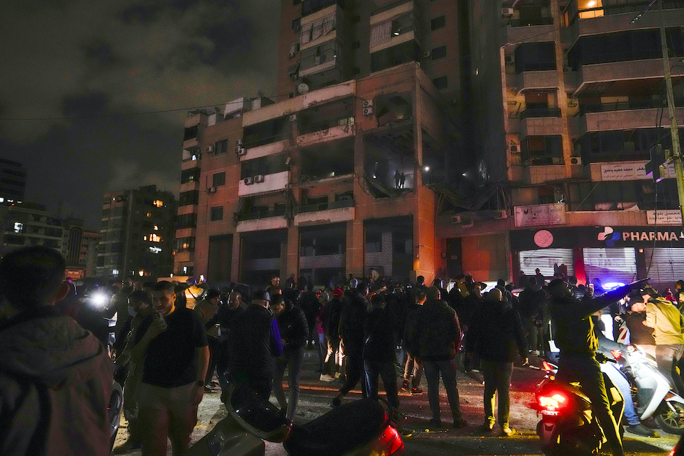 Persone radunatesi sotto l’edificio dopo l’esplosione (AP Photo/Hassan Ammar)