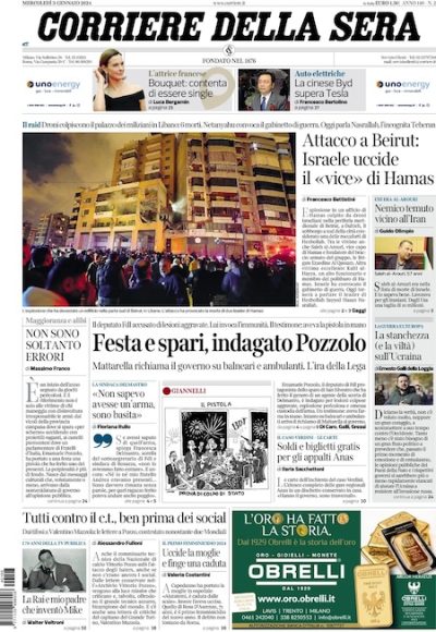 La notizia principale in apertura su gran parte dei giornali nazionali di oggi è l’attacco avvenuto martedì pomeriggio a Beirut, in Libano, in cui è stato ucciso Saleh al-Arouri, vice capo del cosiddetto Politburo di Hamas, il più importante organo politico dell’organizzazione palestinese: il governo del Libano e Hamas hanno attribuito l’attacco a Israele, che non lo ha confermato. Si discute inoltre ancora molto del deputato di Fratelli d’Italia Emanuele Pozzolo, che durante una festa di Capodanno ha ferito accidentalmente una persona con un colpo sparato dalla propria pistola: la procura di Biella ha aperto un’inchiesta, e Pozzolo è indagato per lesioni aggravate. Infine per quanto riguarda la politica c’è il presidente della Repubblica Sergio Mattarella che ha promulgato l’annuale legge sulla concorrenza, che proroga di 12 anni le licenze per gli ambulanti, e che ha evidenziato però al riguardo «profili di contrasto» con il diritto europeo.