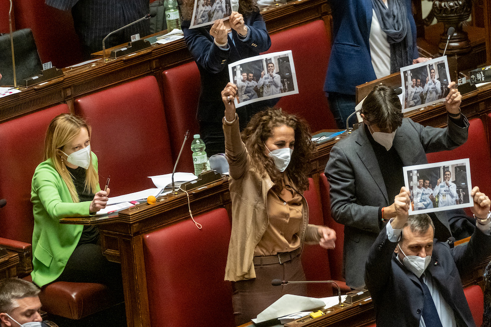 I deputati di Fratelli d’Italia protestano in aula contro la messa a gara delle concessioni balneari, il 17 febbraio 2022 (Mauro Scrobogna/LaPresse)