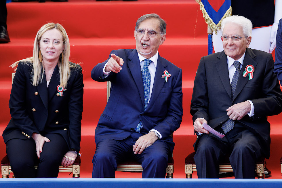 Meloni e Mattarella con il presidente del Senato Ignazio La Russa durante le celebrazioni per la festa della Repubblica, il 2 giugno 2023 (Roberto Monaldo/LaPresse)