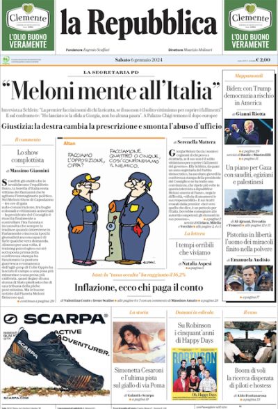 Sulle prime pagine del primo sabato dell’anno hanno molto spazio le critiche della segretaria del Partito Democratico Elly Schlein alla presidente del Consiglio Giorgia Meloni, ma si parla anche di Israele e delle possibili conseguenze della strage vicino alla tomba del generale Qassem Suleimani a Kerman, in Iran. Su alcuni giornali di destra ci sono di nuovo delle foto di Chiara Ferragni legate all’ultimo aggiornamento sulla vicenda dei pandori Balocco: anche Coca-Cola ha interrotto una collaborazione con l’influencer.