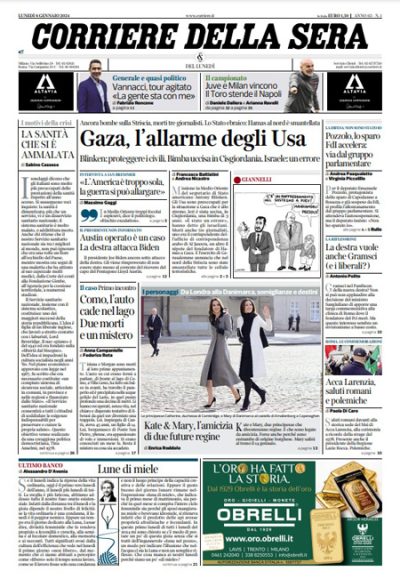 Ci sono notizie diverse in apertura sui giornali di oggi: il Corriere della Sera titola sulla guerra fra Israele e Hamas, con le vittime fra i civili nella Striscia di Gaza e il viaggio in Medio Oriente del segretario di Stato degli Stati Uniti Blinken alla ricerca di una soluzione diplomatica, molti giornali si occupano di politica interna, con le divisioni fra i partiti della maggioranza, le accuse alle opposizioni da parte dei giornali di destra e un’intervista al leader del Movimento 5 Stelle Conte sulla Stampa, Repubblica si preoccupa di possibili truffe nella gestione dei fondi del PNRR, e i giornali sportivi aprono sulla vittoria con la Salernitana della Juventus, che rimane a due punti di distanza dall’Inter in testa alla classifica di Serie A.