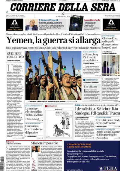 Quasi tutti i giornali di oggi si occupano in apertura dei bombardamenti della scorsa notte in Yemen compiuti da una coalizione di paesi guidata dagli Stati Uniti contro i ribelli Houthi, responsabili degli attacchi delle ultime settimane contro le navi cargo che passavano per il mar Rosso, e delle preoccupazioni per un’estensione del conflitto in Medio Oriente. Repubblica apre invece sulla possibile candidatura alle elezioni europee delle leader di Fratelli d’Italia Meloni e del Partito Democratico Schlein, il Fatto si occupa delle perquisizioni nelle case del sottosegretario alla Cultura Sgarbi e del sequestro di un quadro per il quale Sgarbi è accusato di furto, Libero, l’Unità e il Tempo seguono il processo per la vicenda della nave Open Arms nel quale ieri è stato sentito l’allora ministro dell’Interno Salvini, accusato di sequestro di persona, e la Verità titola sulla fine delle tariffe del mercato tutelato per le bollette energetiche.