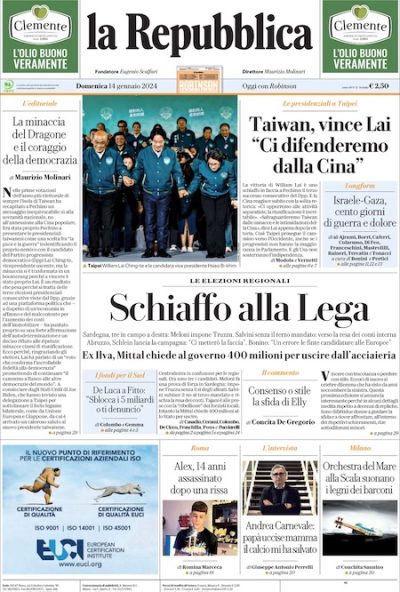 I titoli principali dei giornali nazionali di domenica sono dedicati alle elezioni di Taiwan, dove ieri ha vinto il candidato più critico nei confronti della Cina: Lai Ching-te, del Partito Progressista Democratico (DPP). Si parla poi molto di quella che su molte prime pagine viene definita “la crisi del Mar Rosso”, dopo che nella notte tra venerdì e sabato c’è stato un altro bombardamento degli Stati Uniti contro i ribelli Houthi in Yemen, ma anche delle divisioni del centrodestra sul candidato in Sardegna.