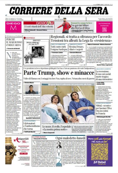 Ci sono notizie diverse in apertura sui giornali di oggi: molti si occupano delle candidature per le prossime elezioni europee e regionali, con le discussioni nella maggioranza di governo su chi candidare alla presidenza delle regioni e l’incertezza sulla candidatura delle leader di Fratelli d’Italia Meloni e del Partito Democratico Schlein alle europee. Repubblica titola invece sui tagli decisi dal governo ai fondi per il Sud, la Stampa si occupa della spesa sanitaria e della povertà in Italia, il Messaggero è preoccupato per l’aumento delle tasse regionali, il Fatto critica le proposte del governo sulla giustizia, e Libero e la Verità si oppongono alla proposta di una tassa patrimoniale fatta dall’ex ministra Fornero.