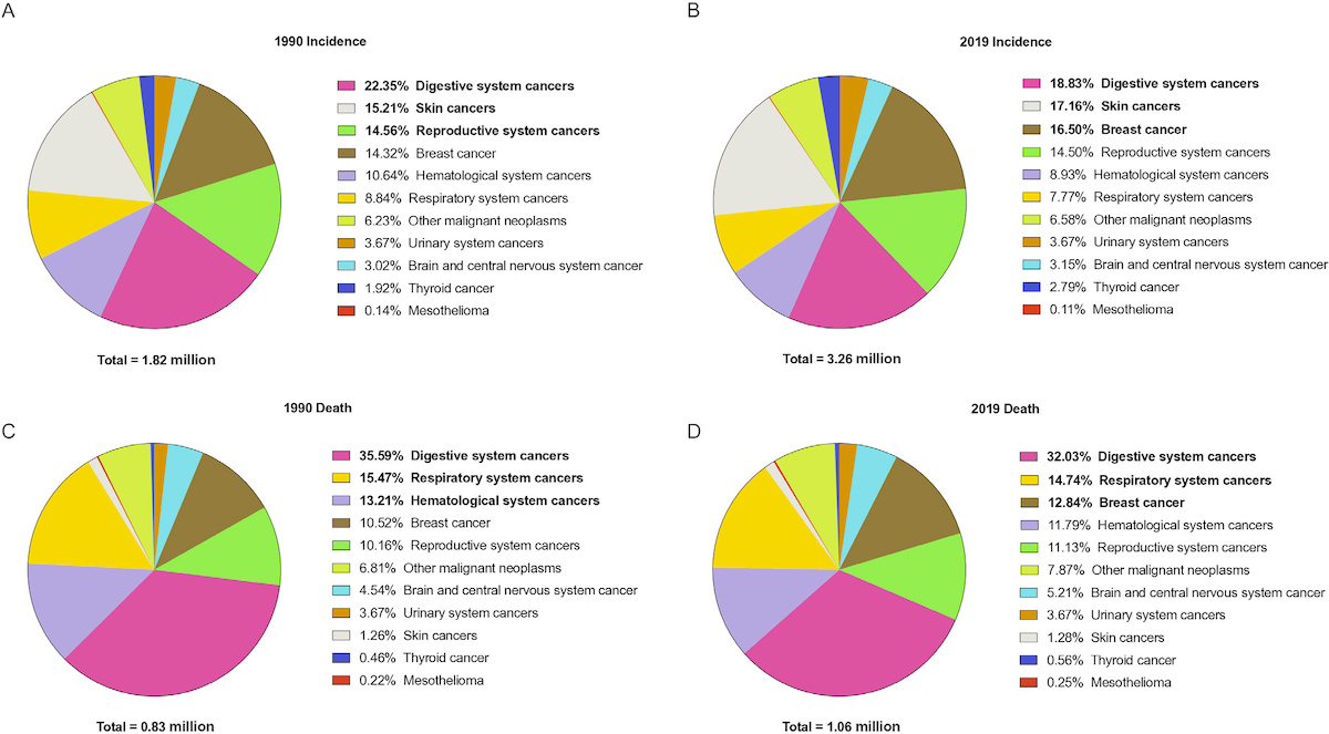 Distribuzione dei casi e dei decessi per i tumori a insorgenza precoce nel 1990 e nel 2019 (BMJ Oncology)