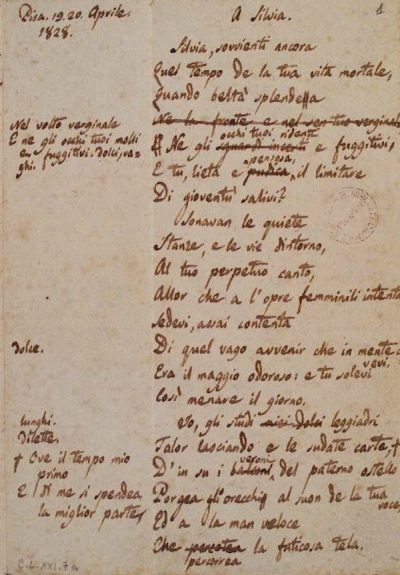 Il manoscritto di “A Silvia” di Giacomo Leopardi, Pisa, 1828 (via Wikimedia)