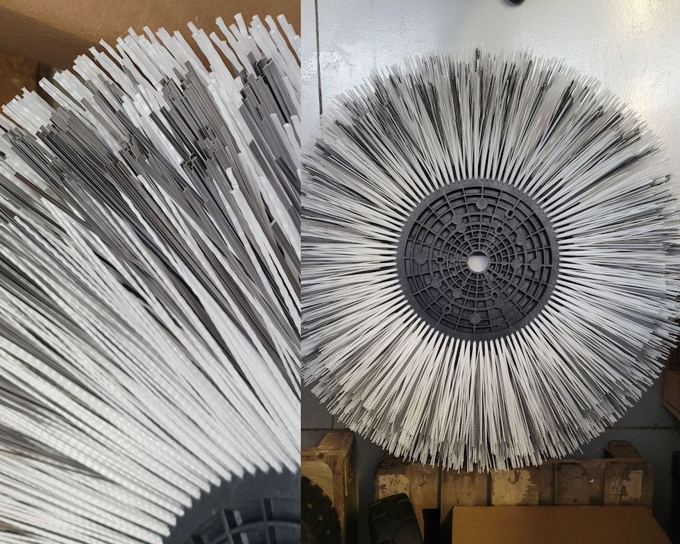 Su YouTube si trovano alcuni video dedicati allo spazzamento delle strade e alla costruzione delle spazzole per spazzatrici. Solitamente, nei modelli misti, le setole in plastica si trovano negli strati più interni e in quelli più esterni, mentre le “piattine” (questo è il loro nome tecnico) di metallo sono all’interno. Le spazzole delle spazzatrici sono pensate principalmente per raccogliere cartacce, rifiuti e polvere dalla strada, facendoli convergere verso l’aspiratore che sta al centro del mezzo. Le setole in plastica sono quelle più morbide e che più facilmente possono infilarsi negli angoli o tra la strada e il marciapiede. Quelle in metallo, oltre a evitare che la polvere si alzi, sono invece più abrasive e più rigide.