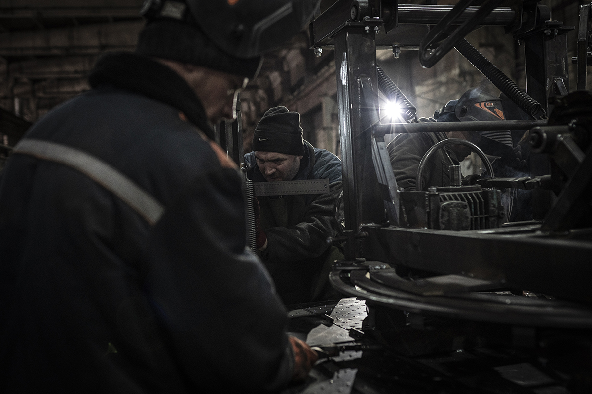 «Il telaio è fatto principalmente in ferro. Dopo averlo costruito smontiamo la parte posteriore del veicolo e installiamo il sistema. Mentre si procede con la verniciatura, io mi occupo della parte elettrica». Il lanciarazzi è infatti comandato da una pulsantiera dotata di un cavo lungo circa venti metri che permette ai soldati di lanciare i razzi tenendosi a distanza di sicurezza, e di risalire sul veicolo e spostarsi prima di essere individuati. Guidandoci attraverso la lunga campata dell’edificio, Artur racconta nel dettaglio l’intero processo: «Taras ha messo a disposizione lo stabilimento e in più paga i suoi operai perché si fermino dopo il lavoro o nei giorni festivi per aiutare nella costruzione e nell’installazione. Se ci fossero più uomini come lui, avremmo già vinto la guerra». Taras ha acquistato e donato all’esercito anche molte auto su cui installare l’US Mini-SRV, ma il gruppo è finanziato soprattutto da donazioni e crowdfunding. I volontari si occupano anche di portare i mezzi finiti ai reparti sul fronte, lontani centinaia di chilometri.