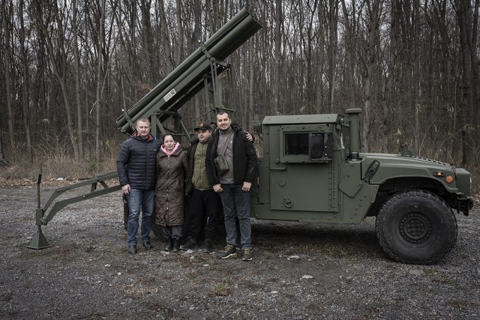 Artur, Denys, Lyuda e Taras di fronte ad un HMMWV da loro equipaggiato con un sistema lanciarazzi multiplo “US Mini-SRV”. Vinnycja, Ucraina, 2023 (foto Edoardo Marangon)