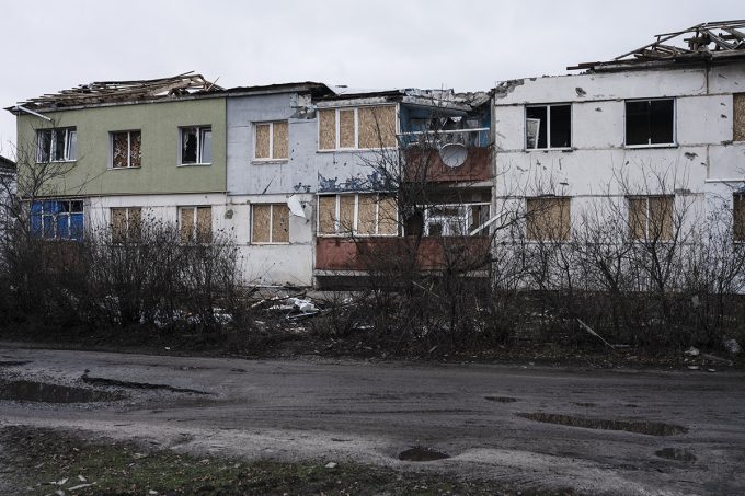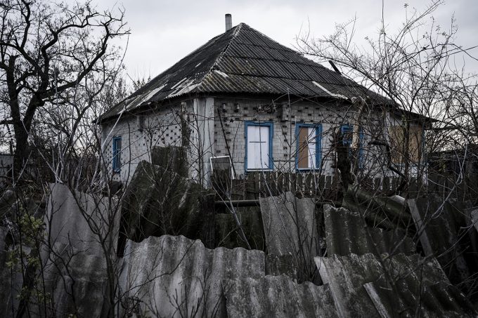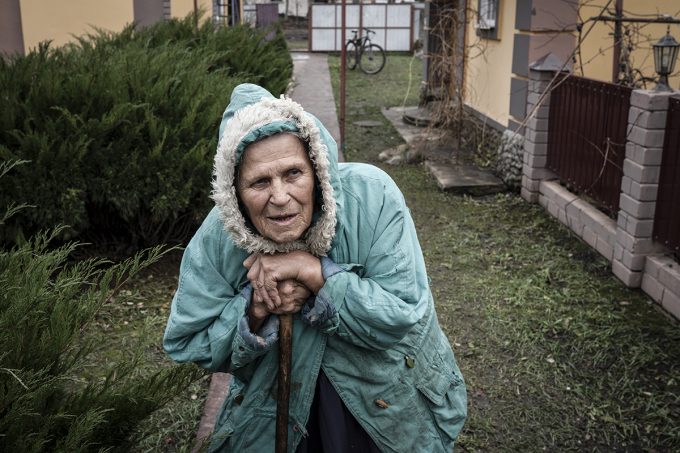 Oltre il cortile della sua vecchia casa bombardata, dopo essersi fatta strada tra macerie sparse ovunque, Alina ha aperto una porta arrugginita che dava accesso alle cantine. Sotto c’era una minuscola stanza con due letti, un tavolino, due sedie e una stufa a legna. «Veniamo a dormire qui ogni notte. È piccolo e fa freddo, ma almeno è più sicuro». Alina ha indicato, qualche centinaio di metri più in là, un’altra abitazione colpita dove poche settimane due persone erano state uccise. Viktor e Alina hanno una pensione misera che non gli permette di trovare alloggio in un luogo più sicuro, da mesi non ricevono aiuti umanitari e non hanno un mezzo di trasporto così, quando hanno bisogno di comprare cibo, Viktor chiede un passaggio ai soldati fino al paese più vicino.