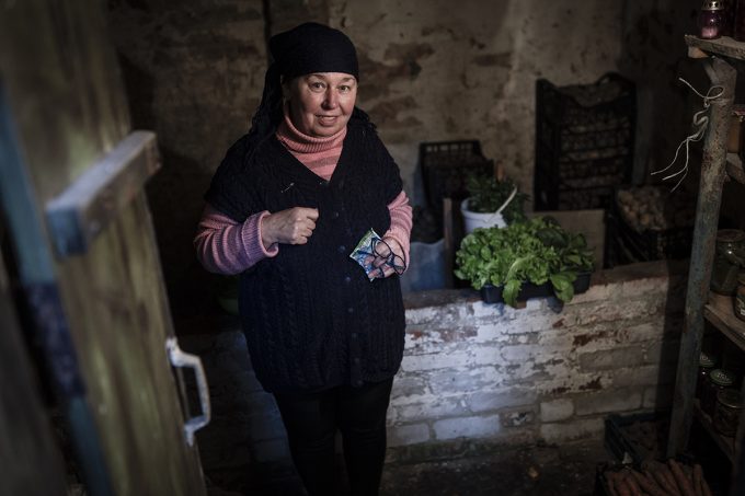 A Kindrashivka, un altro piccolo villaggio a pochi chilometri dal fronte, Nina ci accoglie nella sua casa per mostrarci il suo rifugio antiaereo, un piccolo magazzino sotterraneo scavato in giardino, colmo di barattoli di sottaceti e casse di patate. «Quando il bombardamento si fa troppo intenso, io e mio marito veniamo qui, per sicurezza. In casa abbiamo un generatore, ma il prezzo della benzina continua a salire. Non vogliamo andarcene, tutto quello che avevamo lo abbiamo investito per costruire la nostra casa». Ogni mese Nina riceve scatole di cibo e altri beni di prima necessità dall’ONU e dalle associazioni di volontari locali. «Ma anche quando i soldati russi hanno preso il villaggio», racconta Nina, «abbiamo ricevuto aiuti e supporto. Il governo russo ha anche donato 20.000 rubli ai pensionati». Mentre parliamo i colpi dell’artiglieria si fanno più intensi. Nina sorride, poi ci guarda negli occhi e dice: «Di solito è molto peggio».