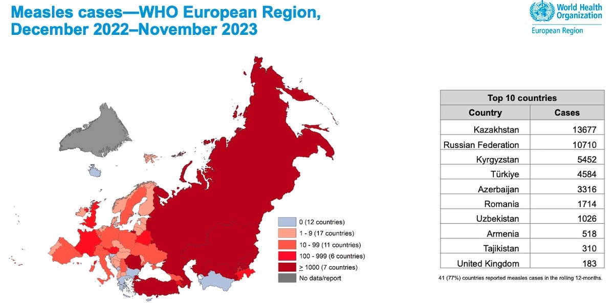 Il paese che ha segnalato il maggior numero di casi di morbillo nel 2023 è il Kazakistan, che tra dicembre 2022 e novembre 2023 ha rilevato 13.677 contagi. Seguono poi la Russia con 10.710 casi e il Kirghizistan con 5.452. La situazione è difficile anche in Turchia, Azerbaigian e Romania. Nel Regno Unito sono stati segnalati 183 casi, molti meno, ma comunque significativi per un’economia sviluppata occidentale.