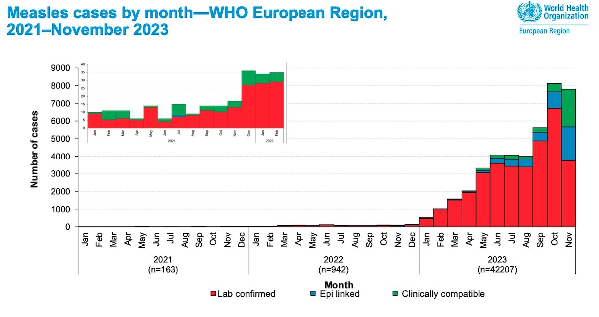 Casi di morbillo nella Regione Europea tra dicembre 2022 e novembre 2023 (OMS)