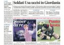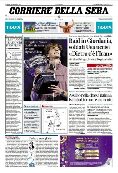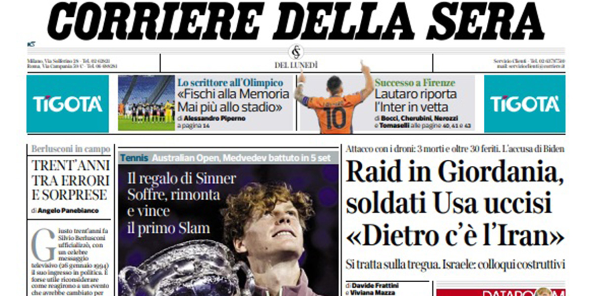 I titoli di apertura della maggior parte dei giornali di oggi riguardano la situazione in Medio Oriente, con l’attacco con droni a una base militare statunitense in Giordania nel quale sono stati uccisi tre militari, di cui secondo il presidente degli Stati Uniti Biden sarebbe responsabile l’Iran, l’andamento della guerra a Gaza, le ipotesi di una tregua per la liberazione degli ostaggi israeliani e l’intervista della Stampa a Papa Francesco, che chiede che vengano creati due stati distinti israeliano e palestinese. L’altra notizia presente su tutte le prime pagine è il successo di Jannik Sinner nel singolare maschile agli Australian Open di tennis, accompagnata dalle foto della vittoria e della premiazione, mentre Repubblica titola sui casi di conflitto di interessi fra i membri del parlamento e del governo.